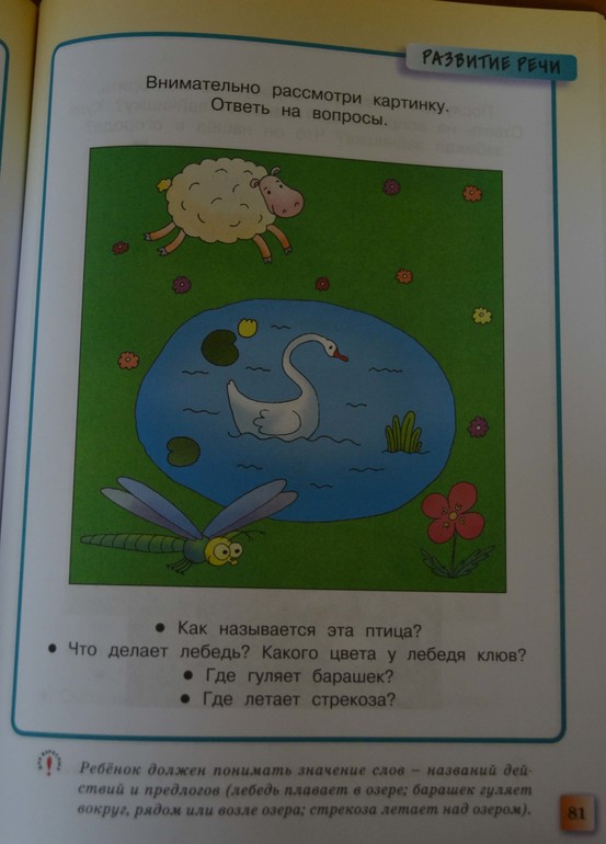 На этой картинке стрекоза летает НАД озером. Составитель вообще сам понимает, что значит НАД - ВЫШЕ, СВЕРХУ! Не просто в воздухе рядом или сбоку. Так почему бы стрекозу не расположить наверху картинки или хотя бы озеро побольше сделать? А барашка можно было и внизу нарисовать. Как вообще малыш должен это понимать?