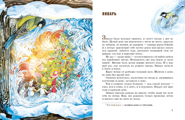 Он рассказывал ей, как называется очередной месяц, к какому времени года относится и что в это время происходит в природе. Так синичка Зинька познакомилась со всеми двенадцатью месяцами и узнала их приметы. А ещё нашла себе друга - синичку Зинзивера и подружилась со многими лесными обитателями. Быстро прошёл год у синички.