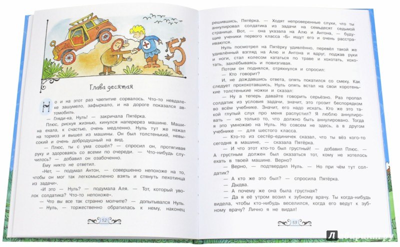 Много удивительных приключений предстоит пережить Але и Антону, оказавшимся вдруг в удивительном мире, который скрывается за страницами учебника математики. Друзьям обязательно надо найти и вернуть солдатика-пехотинца, пропавшего из условия задачи. Ведь иначе всему первому классу "Б" грозят неприятности: тетради первоклашек заполонят целые стаи гусей-двоек. Совершить невероятное путешествие вместе с Алей и Антоном юным читателям помогут замечательные рисунки Виктора Чижикова.
