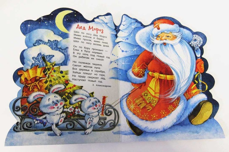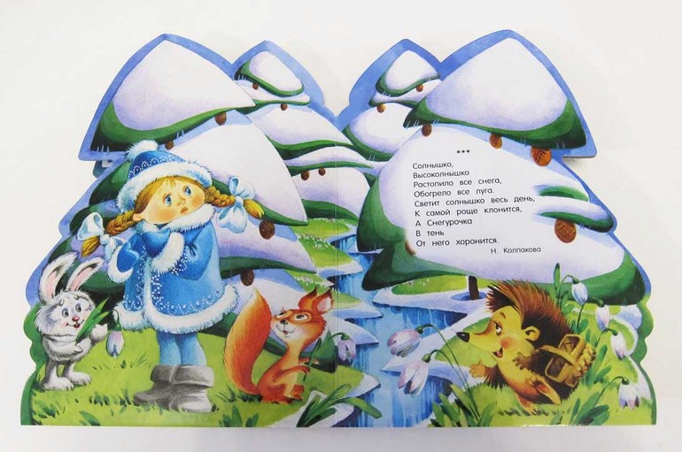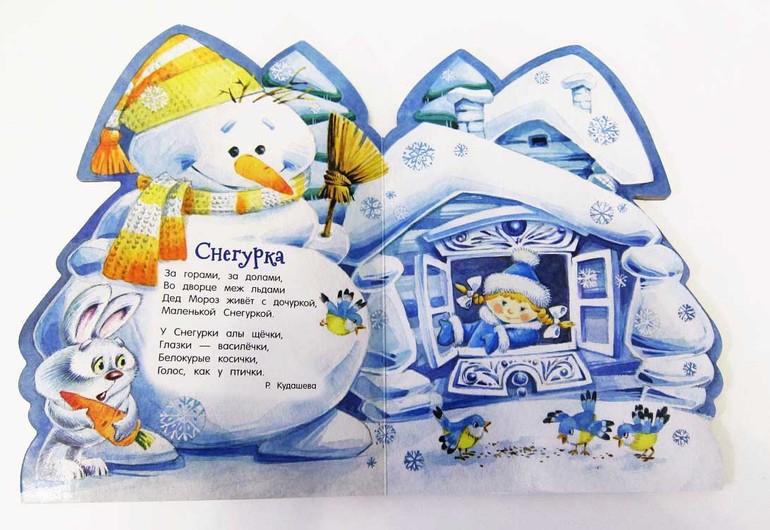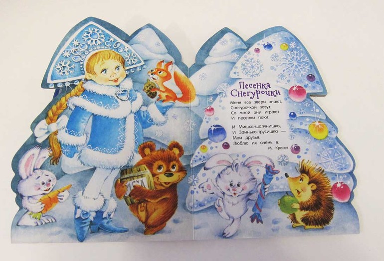 На обложке некоторые элементы оформлены блестками: мех на шубке снегурочки, морковка в руках у зайки, надпись Снегурочка. На фото, увы, плохо видно.