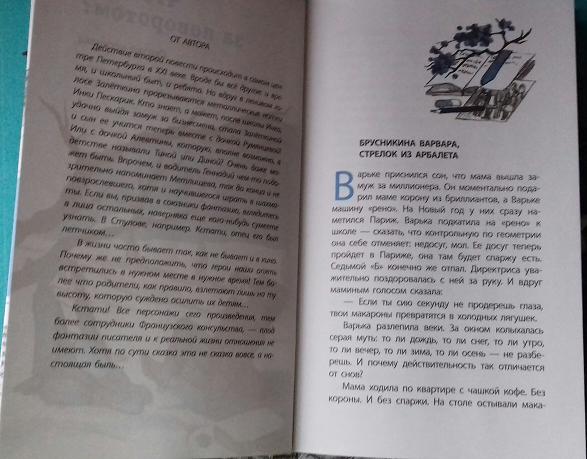 Вторая повесть - фантастическая. Это уже наше время. Девочка находит таинственный приборчик, превращающий все недостатки в достоинства и позволяющий таким образом достичь гармонии с миром и самим собой. Благодаря этому приборчику исполняются нехитрые мечты героини, ее мамы, сына французского посла, который, собственно, этот приборчик и потерял, и его папы. Достаточно короткая фееричная история, по настроению напоминающая фильм "Ёлки", где всегда все всех находят и становятся от этого счастливее. А в мире прибавляется доброты))