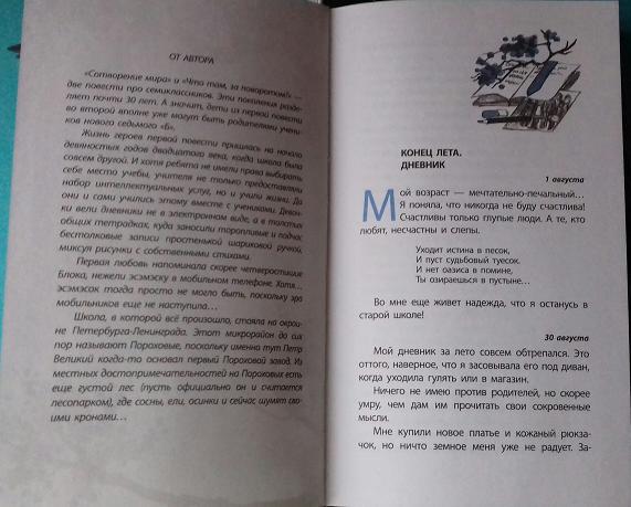 Первая - о 13-летней питерской школьнице из 90-х. Повесть охватывает весь ее учебный год, с 31 августа и по май. Рассказ ведется то от имени самой девочки( через ее дневник, где она, наряду со своими переживаниями, пишет стихи), то от третьего лица, то есть взгляд на нее же и на ее жизнь со стороны. За учебный год случилось многое. Ну прежде всего, она перешла в другую школу, причем мальчик, который ей нравился, остался в старой. Другие учителя( причем часто далеко не идеальные); девчонки, для которых материальное благосостояние - это единственный показатель оценки человека; одноклассник из неблагополучной семьи... Много всего. И - она, скромная отличница со своим очень непростым внутренним миром...