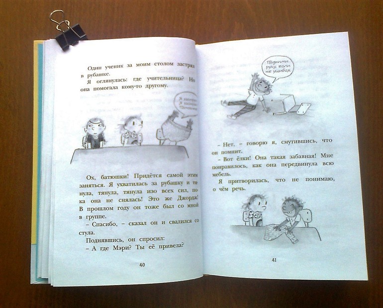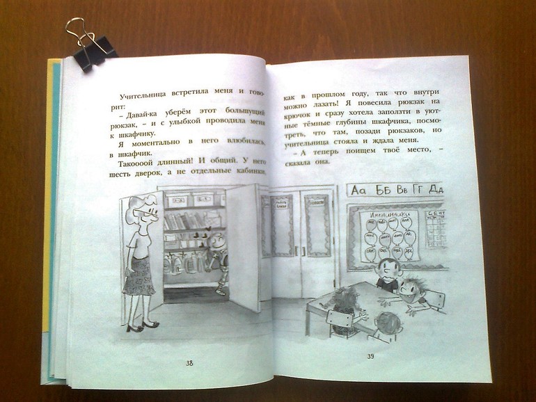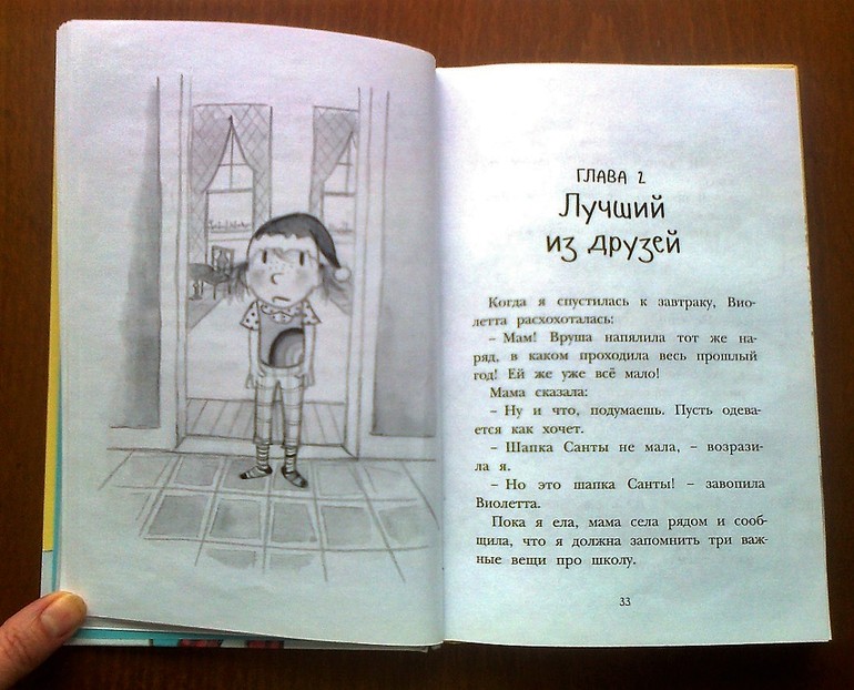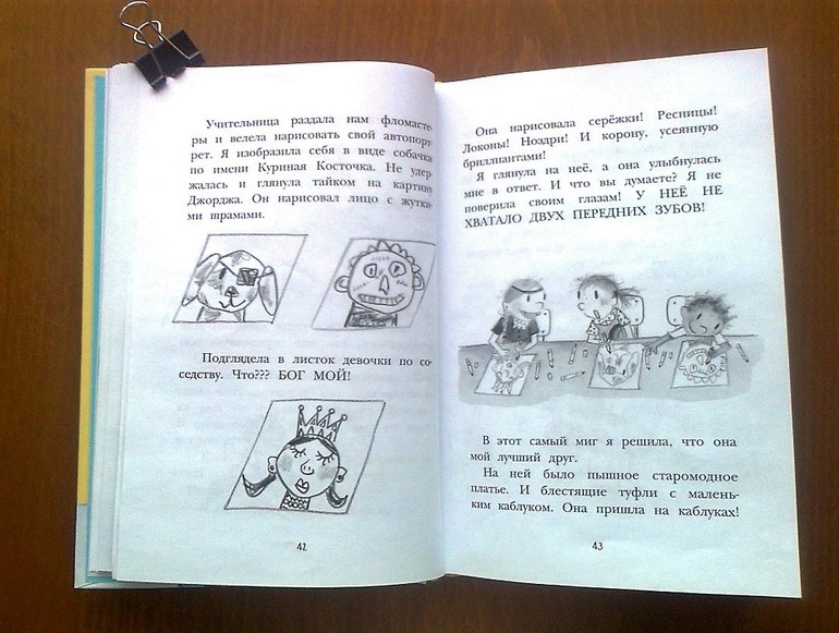 Книжечка короткая, и ее очень трудно сравнивать с другой книгой (посему даю фото разворотов почти целой главы из второй книги ниже). Это такой полукомикс, то есть очень-очень много картиночек. Книга очень эмоциональная, и рассказывается в ней о девочке, шести лет с бурной фантазией, поэтому дома ее зовут Врушей. (В оригинале книга называется Dory Fantasmagory). Ещё ей, как и многим детям, одиноко, ибо старшие брат и сестра изо всех сил ее футболят, им с ней не интересно, в детский садик она не ходит (правда, во второй книге идёт в школу).
