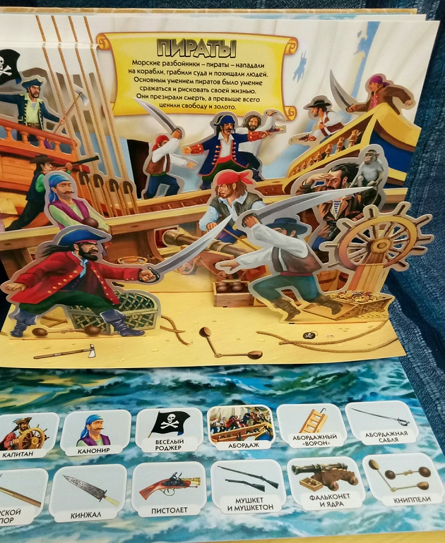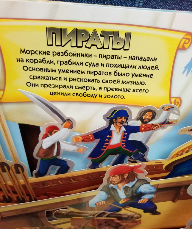 Музыкальное сопровождение включается при открытии странички с панорамкой. Раздается боевой крич и звук мечей, например, при открытии пиратов слышим йо хо хо и лязг шпаг) Нам это книга , конечно, на вырост, но сыну моему пираты уже приглянулись, книжку, бедную, замучил, открывать закрывать, и бегает по квартире с победным кличем йохохо) дочка, услышав это, спросила, вы что там, остров сокровищ смотрите) так что звук дает возможность погрузиться в тему)