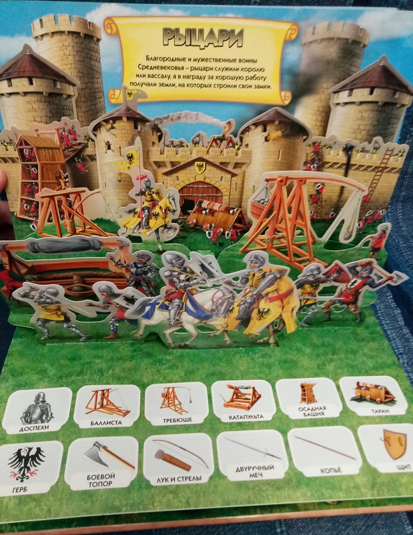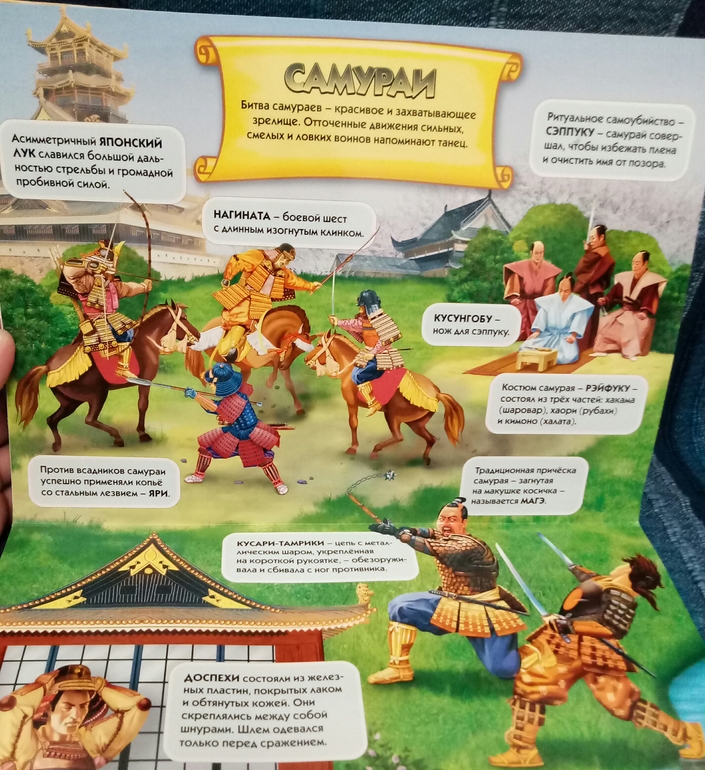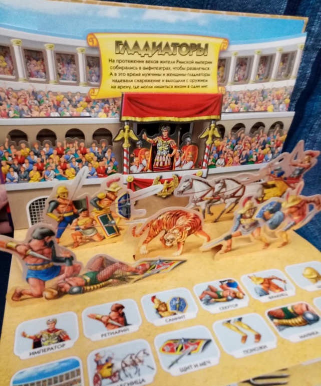 И еще одна музыкальная книга Великие воины из серии Голоса вокруг нас. Тоже издательство Азбукварик 2013 года, цена в майшопе совсем смешная за такую книжку! потому что помимо звукового сопровождения это еще и отличная книга -панорамка! так еще и интересная! В книге сжато рассказывается про гладиаторов, пиратов, самураев, рыцарей. На одном развороте панорамная картинка с кратким определением и со словами, имеющими отношение к данной теме, а на второй разъяснения этих слов.