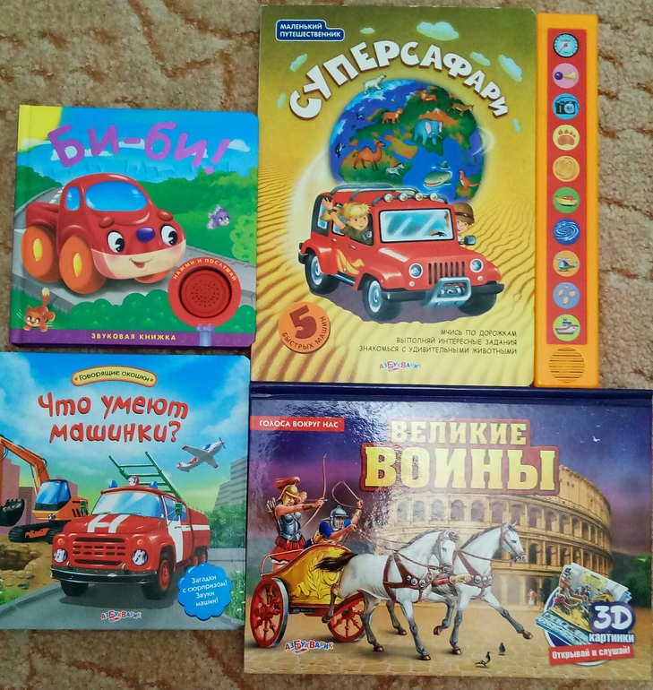 Би- би из серии Звуковые книги изательства Азбукварик тоже из серии баловства. Когда сыну было месяцев 6, я ему купила про котенка из этой серии, где была моя голова в тот момент не понятно, видать, я тогда еще не до конца осознала, что у меня мальчик) нет, кошка ему очень нравилась, но увидев как то раз на обратной стороне и книгу про машинку, как бы помягче сказать, пристал как репей. Так что дед Мороз не выдержал, и подложил в адвент) радости не было предела! честно, не ожидала.. думала, понажимает пару раз и забросит.. и читать просит, хотя что там читать.. 4 разворота по паре предложений, как машинка по дорогам едет и встречает кошечку и другие машинки