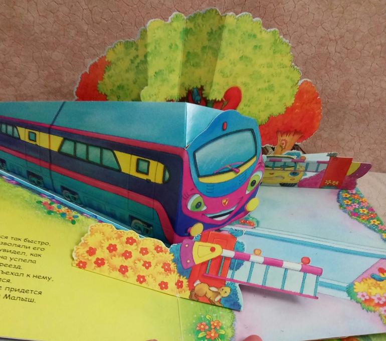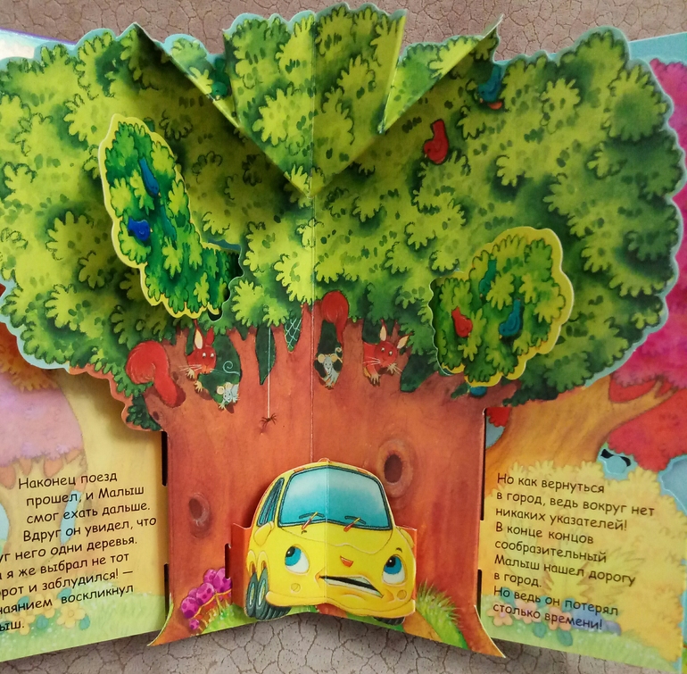 Покажу еще пару разворотов из панорамки Большое путешествие маленькой машинки, текст средний, но объемные рисунки очень красивые