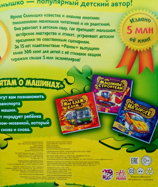Книга с пазлами Важные машины от издательства Ранок. Подробно показывала тут. Вот не могу сказать, что я от нее в восторге, пазлы тонковаты, и имеет обыкновения вываливаться в самый неподходящий момент, но сын любит) и постоянно пальчиком тычет и вот эту еще, и вот эту)