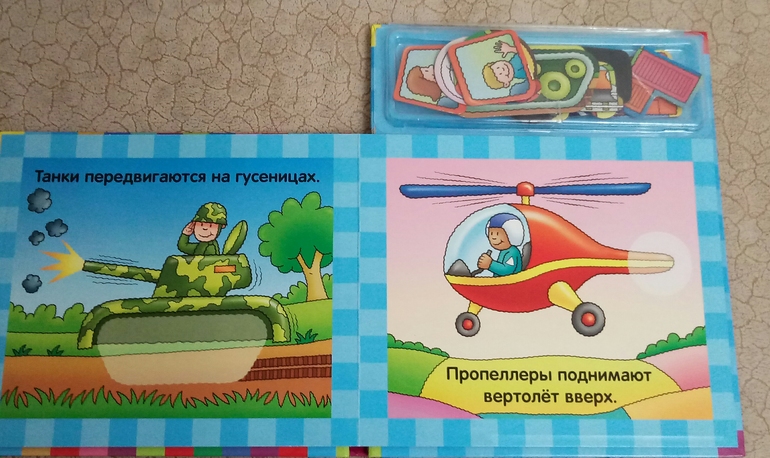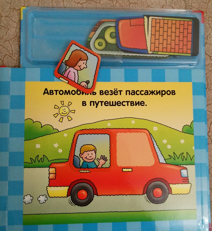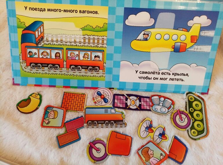 Едем, плывем,летим от издательства Новый формат. Ну очень мальчиковое название!) да и содержание тоже) в книге представлено 12 видов транспорта,без каких либо частей) эти недостающие части представлены отдельно в виде магнитов, надо найти , что отсутствует, отыскать нужный элемент и прикрепить!