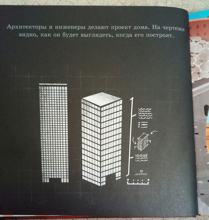 Книга от издательства Феникс Что скрывает стройка К. Браун из серии Читаем с фонариком. Долго я выбирала какую же книгу приобрести из этой серии, и море интересно, и под снегом, но все таки остановилась на Что скрывает стройка? Все таки эта тема ближе мальчику) В книге подробно показаны все этапы строительства нового дома от чертежей до заселения новых жильцов. На страничкам встречается много строительных машин, а когда светим фонариком с другой стороны странички, нам открываются тайны стройки) вот чертеж, а что на нем?)