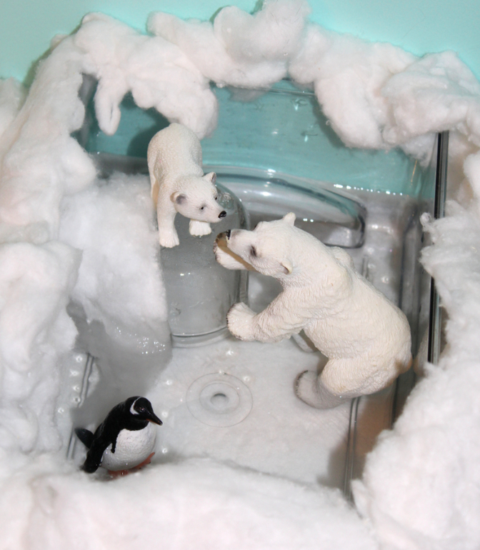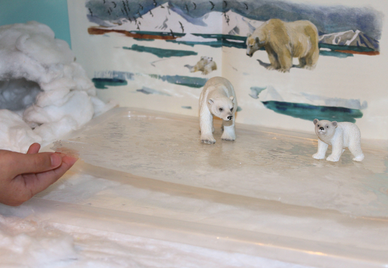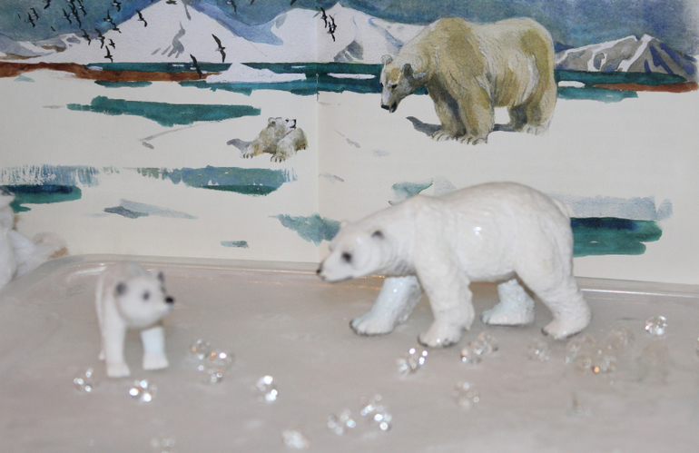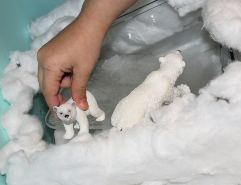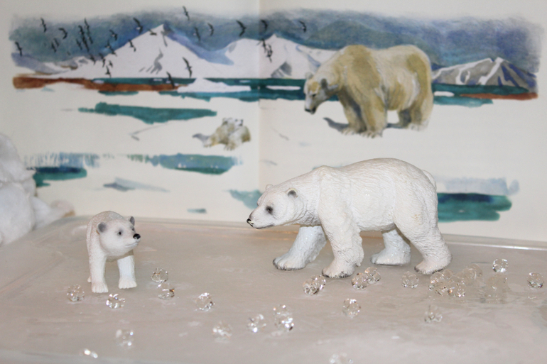 Книгу мы читали великое множество раз. Видя такой интерес со стороны ребёнка, я предложила поиграть по мотивам сказки. Это предложение, как я и предполагала, вызвало бурю восторга!) Приготовления к игре минимальные. Из ваты накручиваем снежные барханы, в контейнер наливаем воды - это будет океан. На поднос, или на крышку от икеевского котейнера, как в нашем случае, тоже наливаем воду и в морозилку на пару часов. Если есть гидрогель, здорово! Он во время игры развивает мелкую моторику и служит пищей для Умки и его мамы). Берлогу можно сделать из любой коробки, достаточно просто обмотать её ватой. У нас осталась жестяная банка из-под новогоднего подарка, её и решено было использовать.)