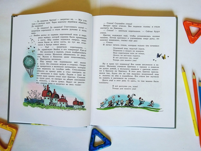 Сюжет, я думаю, пересказывать не нужно? Это как раз первая сказка о Незнайке, в которой коротышки построили воздушный шар, полетели на нем путешествовать и оказались в Зеленом городе. Из положительных, в воспитательном плане, моментов - затрагиваются темы дружбы между мальчиками и девочками, и умения прощать за разные, даже крупные проступки. А также много к вопросу "что такое хорошо, и что такое плохо": врать и обманывать - плохо, драться и обзываться - плохо, трудиться и помогать друг другу - хорошо, учиться - хорошо, ничего не знать - хоть и весело, но плохо, радоваться, веселиться, танцевать - хорошо. В общем, большая часть сюжетов и действий тем или иным образом касаются детей в возрасте старших дошкольников/младших школьников, и поэтому будут им интересны. И в ненавязчивой форме сказки донесут до ребенка правильные мысли и истины.