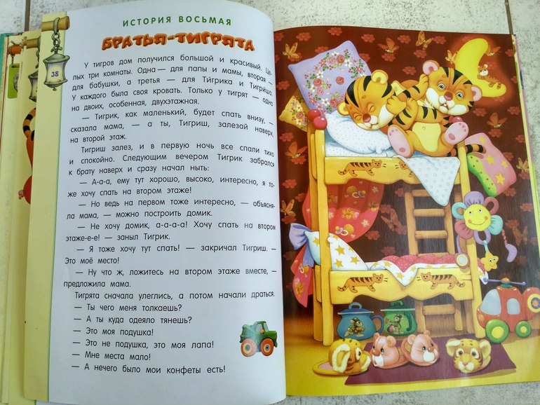 Ещё очень нравится глава про братьев тигрят. Как и дети они то ссорятся, то мирятся, то им одновременно нужна одна и та же вещь!! И вот один из них говорит "не хочу я такого брата"! И остался один, все игрушки его, никто ему не мешает! Да только скучно так, и он понял как он любит брата, как ему его не хватает!