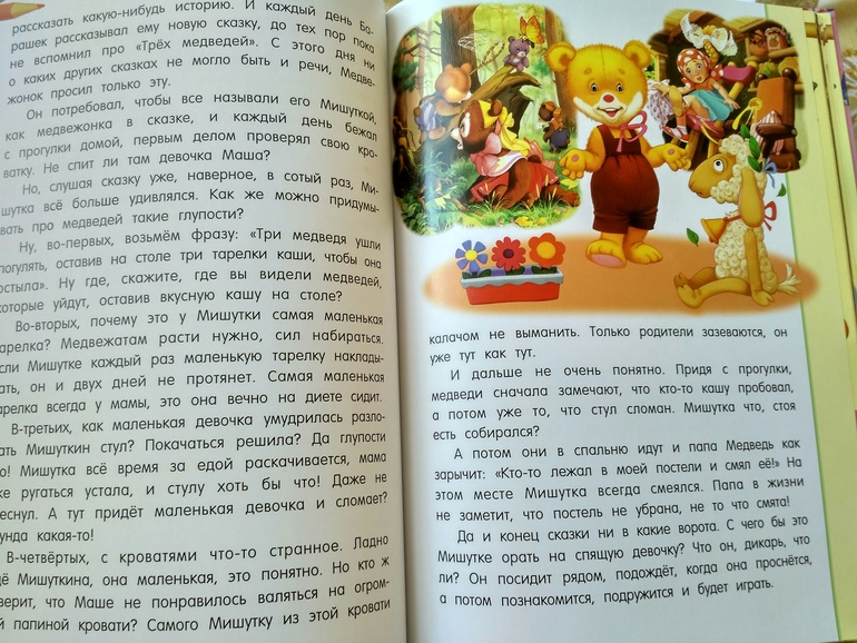 И второй момент в книге, который мне не нравится, это критика сказки "Три медведя". Да конечно я как взрослый человек согласна, что вряд-ли Медведи бы оставили обед на столе и пошли гулять, или что Маша скорее бы выбрала большую кровать для сна, чем маленькую. Но дети, для кого адресована эта книга верят в сказку и им не нужен пока критический взгляд на любимых героев.