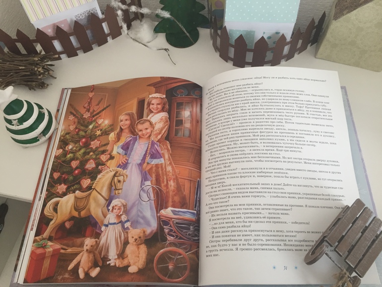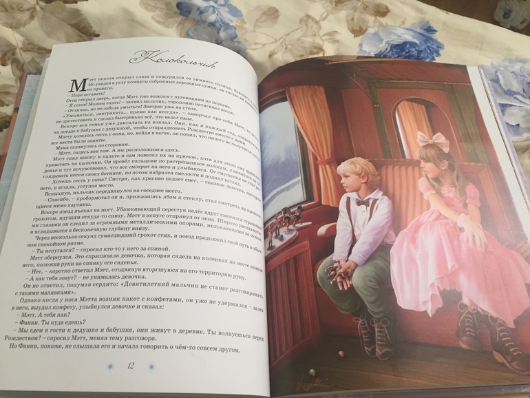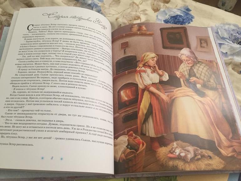 Начиная с внешнего вида книги все очень достойно. Твёрдая обложка, формата чуть больше а4, глянцевые страницы с совершенными иллюстрациями, такими красочными, сочными и в то же время такими реалистичными с прописанными мелкими деталями. Иллюстратору надо выдать медаль))) при прочтении создаётся ощущение, что еще немного и со страниц повеет ароматом хвои или имбирных пряников:-))) Эта книга потрясающая по своему посылу-добрая, учащая состраданию, пронизанная светом и теплотой...Книга предназначена для детей младшего и среднего школьного возраста. Язык изложения непростой, с разнообразным лексиконом. Мне хотелось читать книгу в размеренном темпе, останавливаясь и обсуждая некоторые моменты. То ли потому, что читала я девочкам 3,5 и 2-х лет, то ли потому, что книга располагает к размышлениям и рассуждениям. У книги большой побуждающий эффект, она заставляет нас задуматься о вечном, заботиться об окружающих, делиться своим душевным теплом, делает нас добрее и чувствительнее в этом непростом и местами жестокость мире. Истинное рождественское чтение. Желая воссоздать атмосферу книги мы нагромождали подушками кресло около камина и, завернувшись в плед, читали рассказы под треск поленьев... семь чудесных рассказов, которые подарили нам незабываемые моменты семейного чтения. Крайне редко я испытываю однозначно положительные эмоции в адрес книги))))) а тут столько елея разом:-)Поддавшись очарованию книги я заказала ее в подарок для сестры, расписав этот шедевр в лучших красках. Сестра, надо уточнить, ооооочень требовательный читатель. С трепетом я ждала отзыва о книге))) и каково же было мое изумление, когда наш всеми любимый интернет магазин прислал в Волгоград казахский вариант этого издания)))) вернее первый рассказ был на русском, а вот все остальное, увы. Так что будьте внимательны, если захотите приобрести это чудо:-)Несколько фото разворотов: