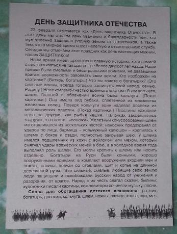 Набор карточек "Защитники Отечества" . Там и рисунки неплохие, и много информации на задней стороне каждой карточки.