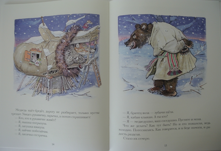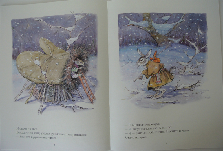 Рукавичка - зимняя вариация "Теремка". Дочке нравится, только в этом году пыталась в конце сказки прогнать собаку. Жалко ей стало, что животные лишились своего дома. А прошлой зимой удивлялась, как в рукавичку все поместились:)