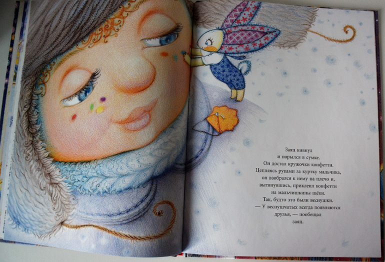 Сказка Евдокимовой поет и искрится. Необычайно красиво перетекают слова из предложения в предложение. Я и сама была восхищена, когда впервые читала, а уж дочке как понравилось слушать сказку о новогоднем игрушечном зайце! Ощущение, что Евдокимова щекотно шепчет в ушко только тебе волшебную историю. И такая радость читать все эти мельчайшие описательные детали, из которых и соткана сказка.