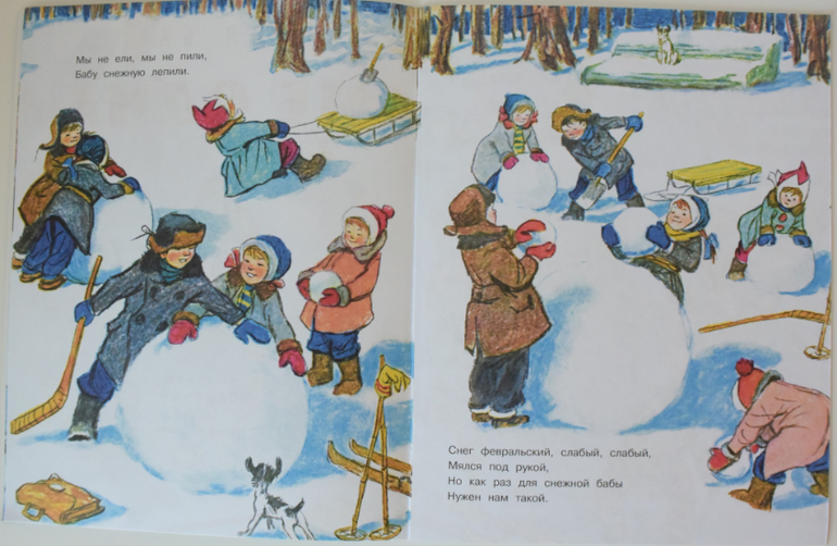 Тоненькая небольшая книжка со стихами о том, как дети лепят снежных баб. Вика особенно часто в последние дни вниматеьно рассматривает рисунки и просит почитать. На разворотах узнает своих друзей из дет.садика и делится впечатлениями, как каждый день с воспитательницей лепят снеговиков, снежному петуху раскрашивают золотой гребешок и бегают вокруг других снежных фигур. Да и я с любопытством рассматриваю в окно, какую красоту они налепили на площадках. В садике проводится конкурс снежных фигур, у нас -дымковские игрушки. Очень удачно выпала месячная норма осадков, снега - хоть ешь, лепи - не хочу:)))