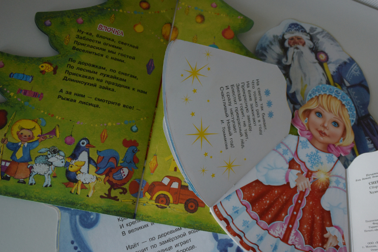 3 тоненькие книжки с вырубкой поселились дома накануне Нового года. Вика тааак радовалась - не передать словами. Вся новогодняя атрибутика для нее была собрана: Дедушка Мороз, Снегурочка и нарядная елочка. Так подряд стихи с песнями и читаем. Есть несколько пересечений (2 или 3), можно в принципе было обойтись либо Елочкой, либо Дедом Морозом. Дед Мороз напечатан чуть хуже, ощущение пыльности и бледности на разворотах. Но Вике нравится сравнивать рисунки. Снегурочка - для меня вообще баловство. А дочка всех книжных куколок собирает. Это ее подружки:)).