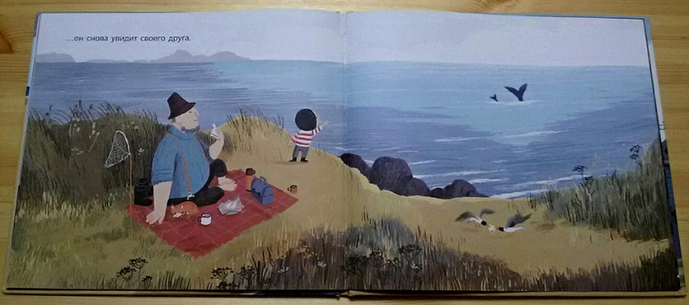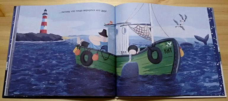 Текста в книге мало, сюжет простой - мальчик спасает кита, потом они вместе с папой отпускают его обратно в море. Это становится началом новой дружбы, про которую речь пойдет уже во второй книге. Но при этом первая часть вполне самостоятельна и закончена. Она оставляет читателя в надежде на то, что друзья скоро встретятся вновь.