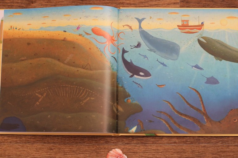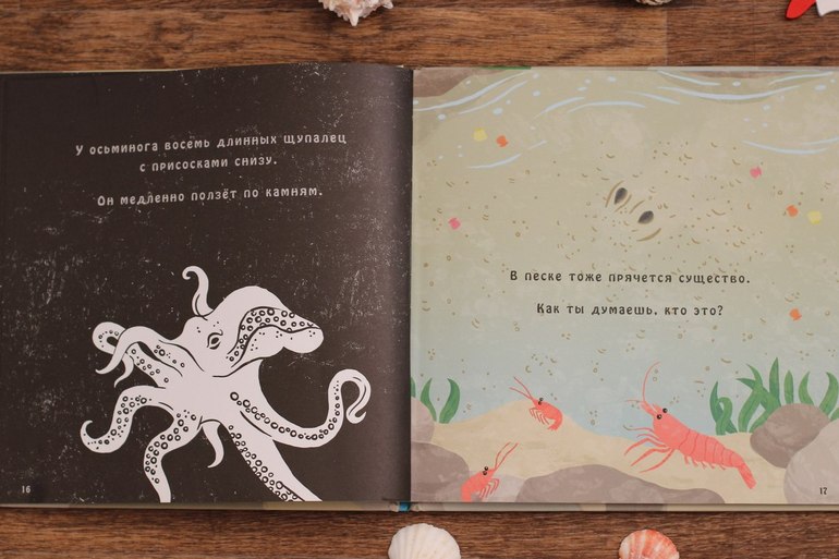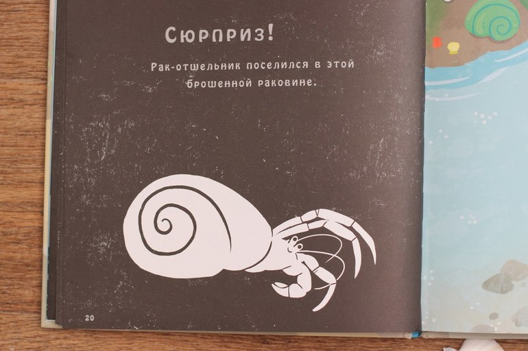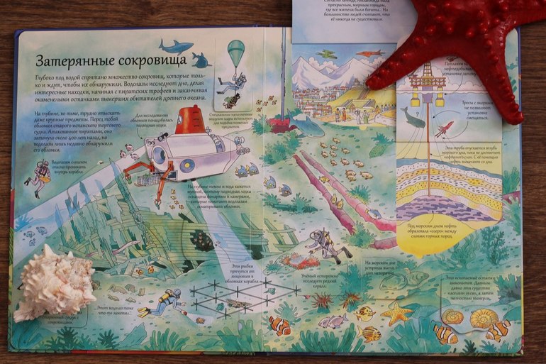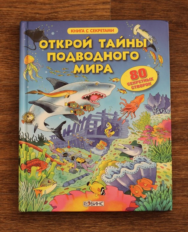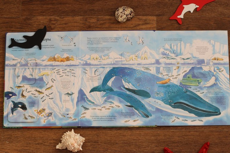 Я знала, что это будет фурор! Но популярность этой книги в нашей семье превзошла все мои ожидания! Плотный картон, красочные иллюстрации, множество секретных окошек, интересных фактов даже про самых глубоководных животных. Наш любимый разворот с китами.