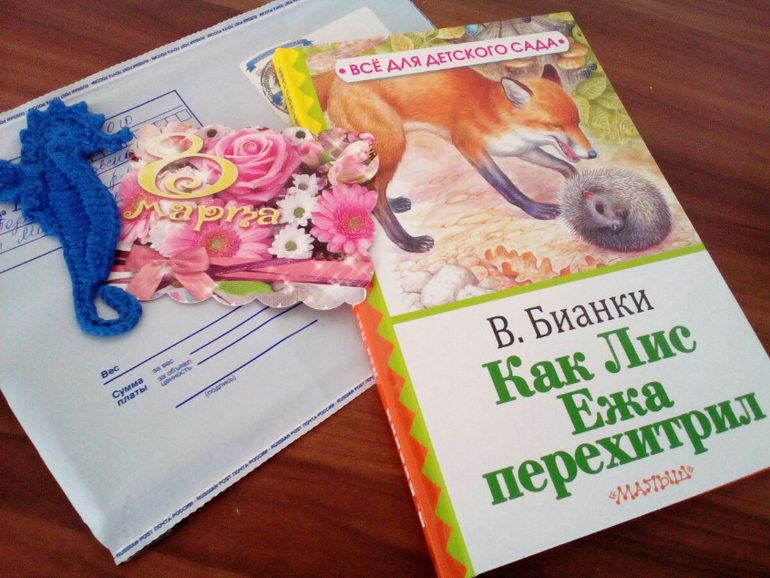 Спасибо!!!А у нас сегодня весна началась. Ну и что с того, что на улице -3. Зато у нас уже самое весеннее, 8-ми мартовское настроение, потому что сегодня к нам прилетел вот такой замечательный сюрприз: с тёплыми пожеланиями и цветами, замечательной книжулей и мега-супер-рукоделочкой (Оль, конёк классный!!!!!) от Оли .