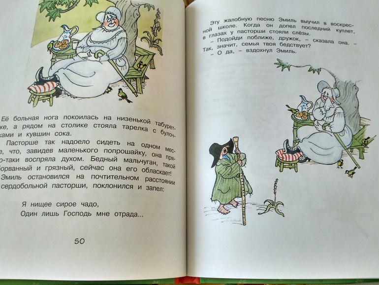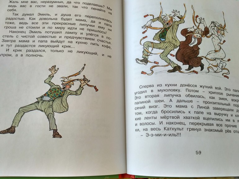 А мне про мухоловки понравилась, в доме было много мух и мама хотела купить мухоловки, как у соседей. Но папа спорил, что это лишняя трата денег, и вообще они так скоро по миру пойдут! И вот Эмиль размышляет, что же делать в такой ситуации : "Во-первых, жалко маму, ей страх как хочется получить эти самые липучки. Во-вторых, они их все равно получит - уж мама то своего добъется. В третьих, папу тоже жалко : вдруг все деньги уйдут на липучки и ему придётся просить милостыню? В четвертых, милостыню лучше просить заранее, чтоб на собирать денег на липучки.. И уж если кому и просить милостыню, то не папе, а ему, Эмилю. Вот задачка и решена! "