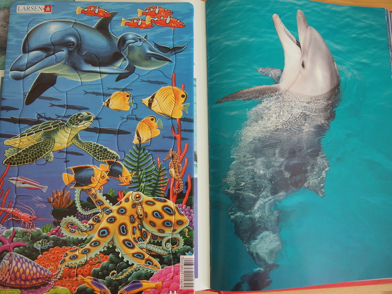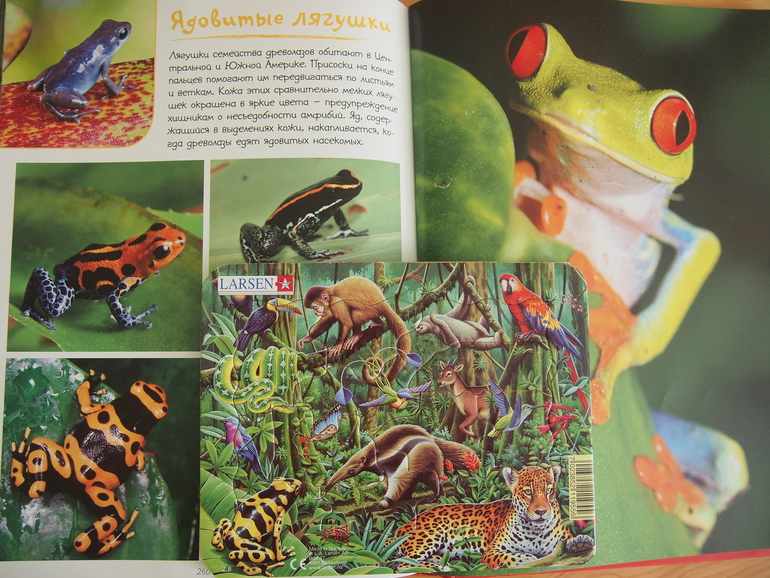 "Моя большая книга о животных" у нас пока не пошла. Леша листает ее пару минут и закрывает. Пыталась завлечь его поисками животных изображенных на пазлах, но и это не помогло.