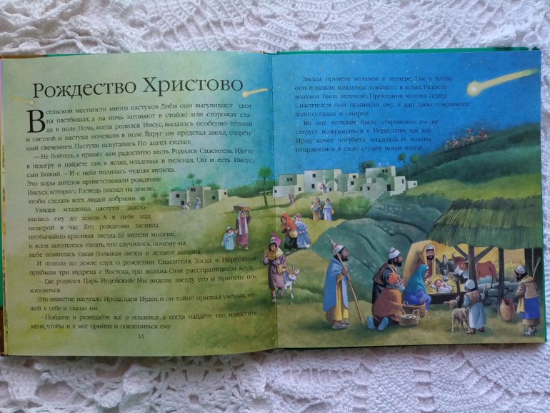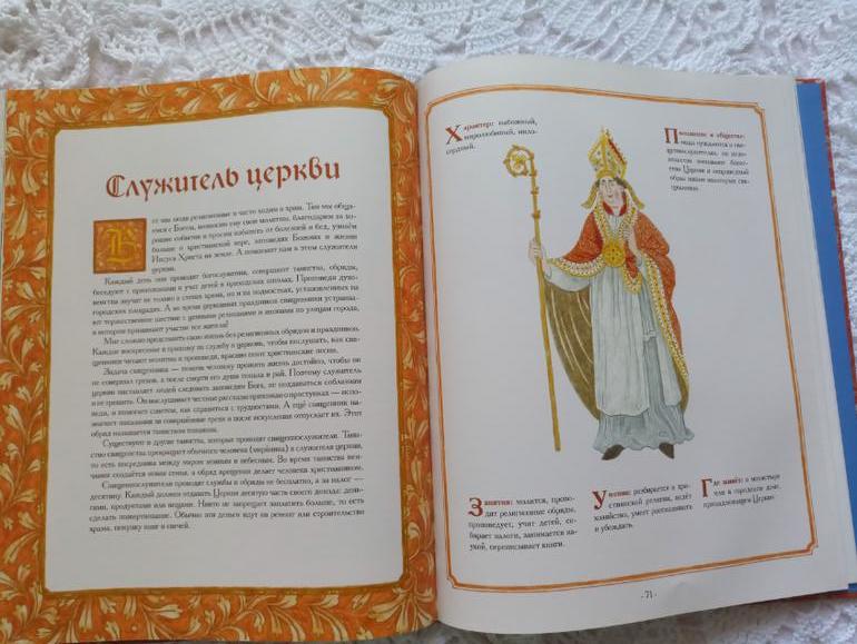 Автор одним предложением упомянул наличие другого вероисповедания. На одной странице дети узнали и о создании мира, о заповедях и грехе, о Троице и ангелах, о молитве и дьяволе. У дочек проснулся интерес к библии, правда у нас не самое удачное издание....