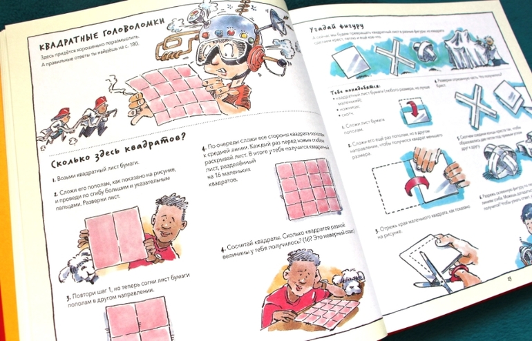 О каждой фигуре есть все: от описания и измерения, до головоломок и наблюдений в жизни. Перечислить не смогу все - на каждый вопрос до разворота отведено. Посмотрите на фото содержание - здесь только про квадраты. Много мастер-классов, заданий, опытов, головоломок.