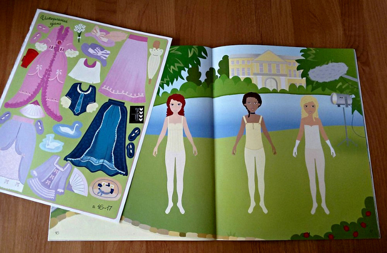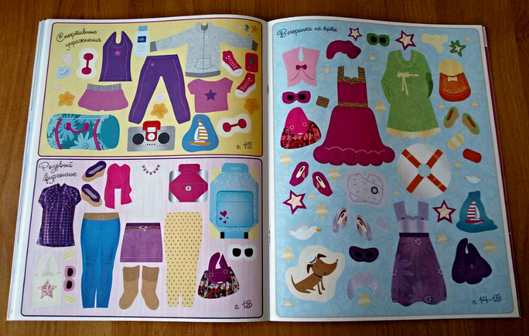 Мы обычно выдираем лист с наклейками, находим нужный разворот и дочка приступает к любимому занятию. Очень удобно, что незнакомые и специфичные предметы одежды подписаны, чтобы было легче разобраться что и куда клеить.