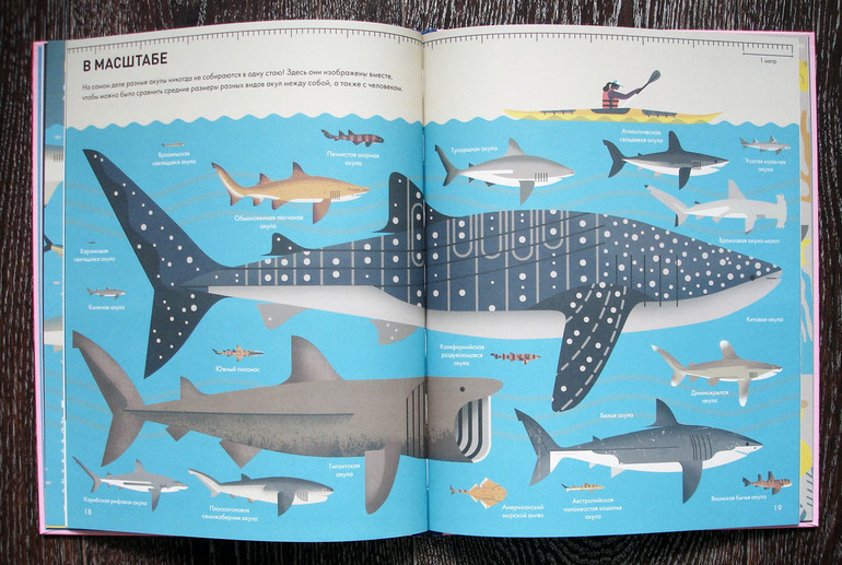 Разворот с различными видами акул и их масштабами по отношению друг к другу.