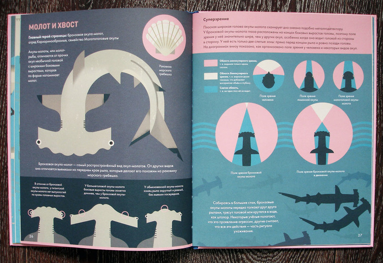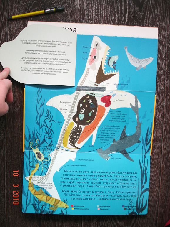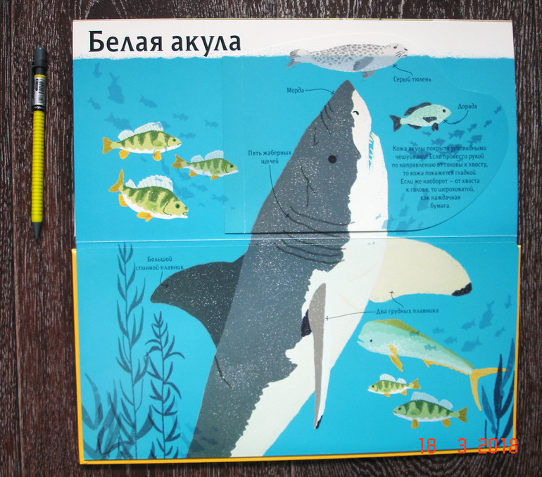 В книге есть разворот про улитку, про курицу, про корову, про змею, но уж чтоб не отходить от названия поста - покажу разворот с акулой!