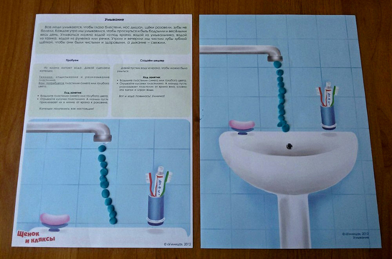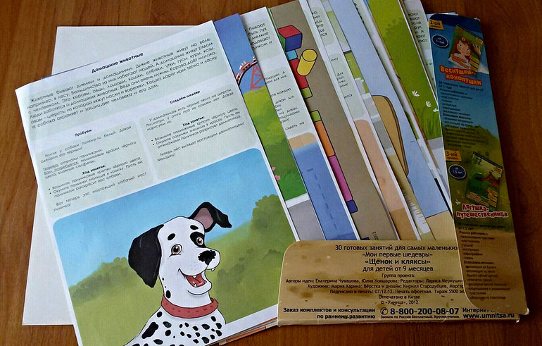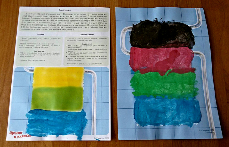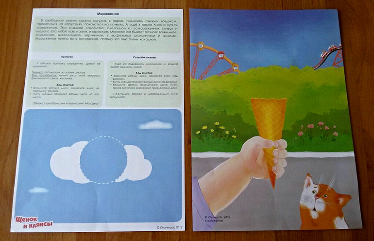 На арт-листах описаны занятия по рисованию, аппликации и лепке. Производитель предлагает заниматься по ним уже с ребенком девяти месяцев, но у нас подобные занятия пошли только после двух лет. Пока мы осилили только первый уровень, который называется "Щенок и кляксы". Он познакомит малыша с самыми простыми техниками: отпечатки ладошкой, рисование пальчиками, создание лепешек из пластилина, обрывная аппликация, кляксы кисточкой.