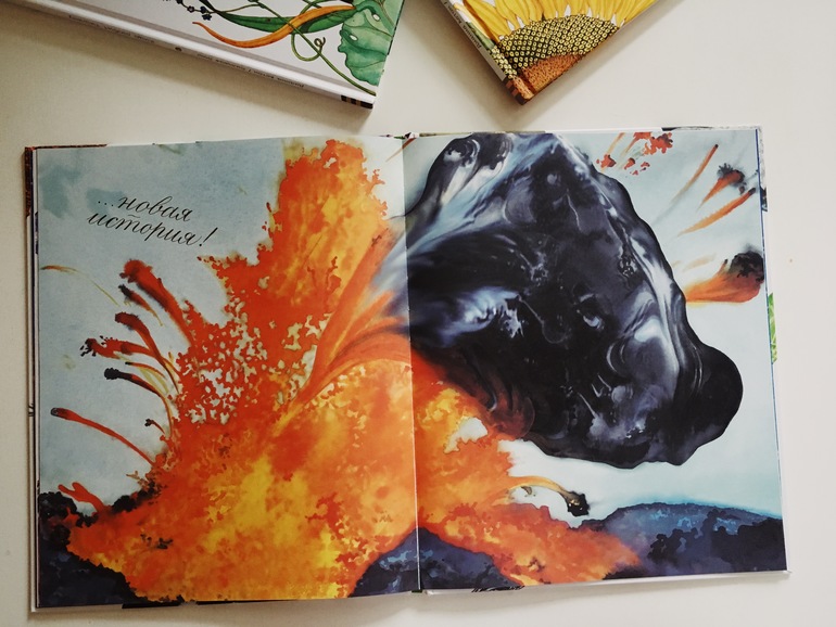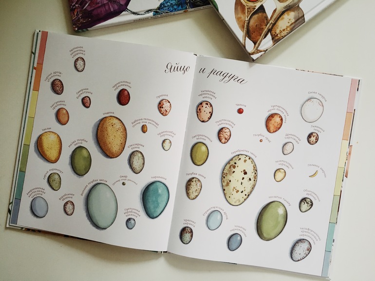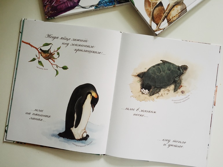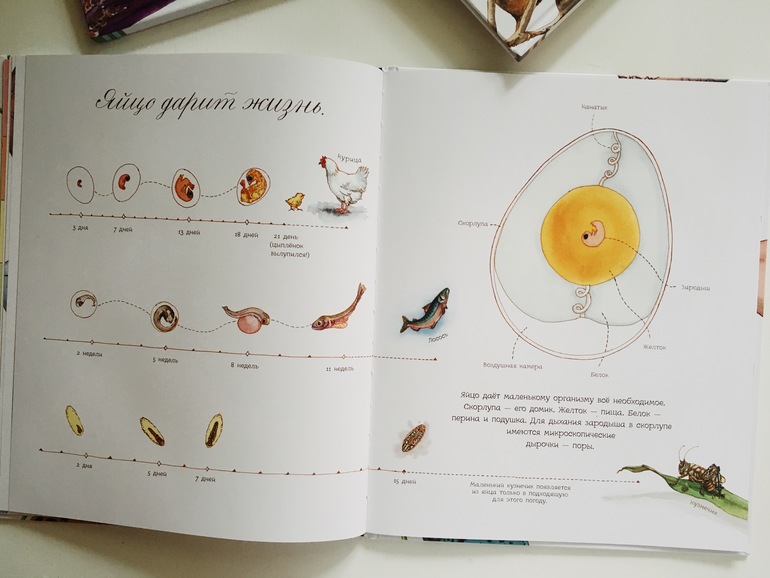В обеих книгах на двух самых первых страницах нарисовано много семян и яиц, а на двух последних - то, что из них вырастает или вылупляется. Очень интересная идея!