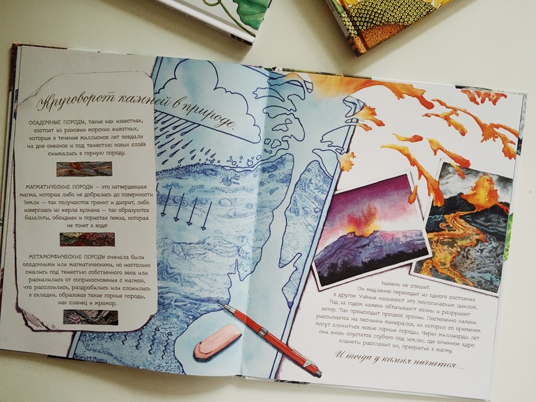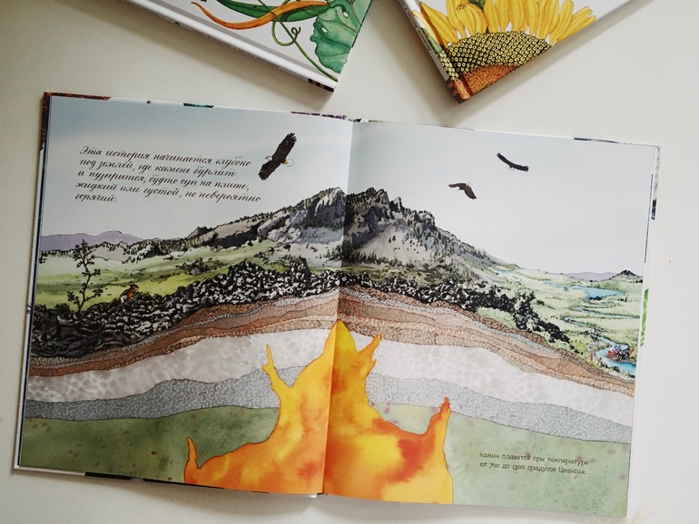 Везде, даже в книге с камнями, автор рассказывает про цикличность нашей жизни. Мне кажется, это очень интересная тема, которую можно развить ещё дальше, пообщавшись с ребёнком про круговорот воды в природе, про времена года и т. д.