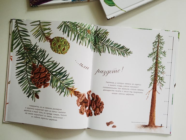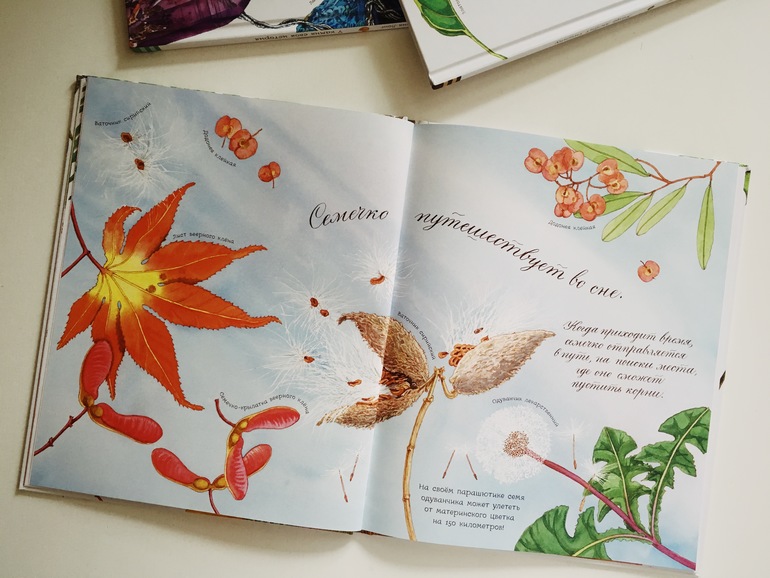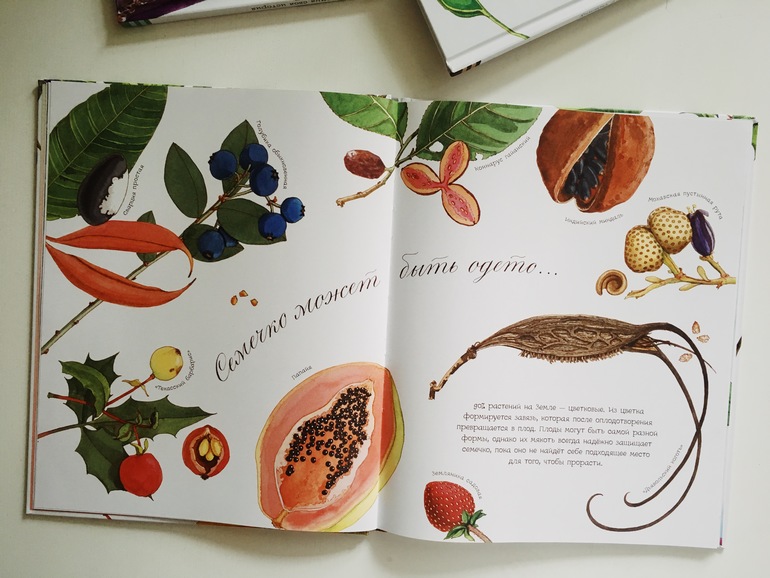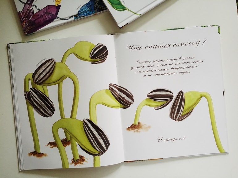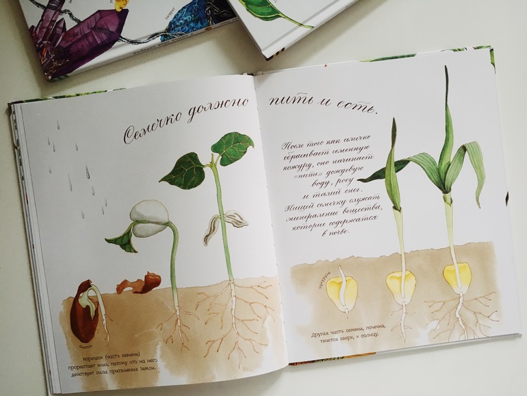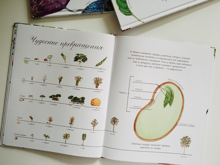 В первой упоминаются разные виды семечек, что из них может вырасти, каким образом семена могут перемещаться, чтобы найти себе лучшее место для жизни, показано семечко в разрезе и даже есть схема с поэтапным изображением прорастания семечка и превращения его в какое-нибудь известное нам растение или овощ.