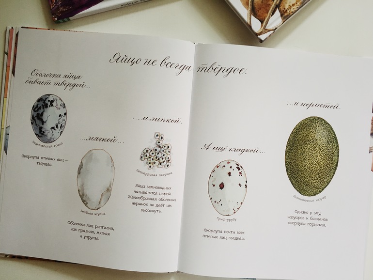 Вторая книга рассказывает о различных видах яиц, описывая их цвет, форму, размер и даже твердость оболочки. Показано яйцо в разрезе. Так же, как и в книге про семечко, здесь поэтапно изображено, как из яичка или икринки через определённое время появляется цыпленок, рыба и кузнечик.