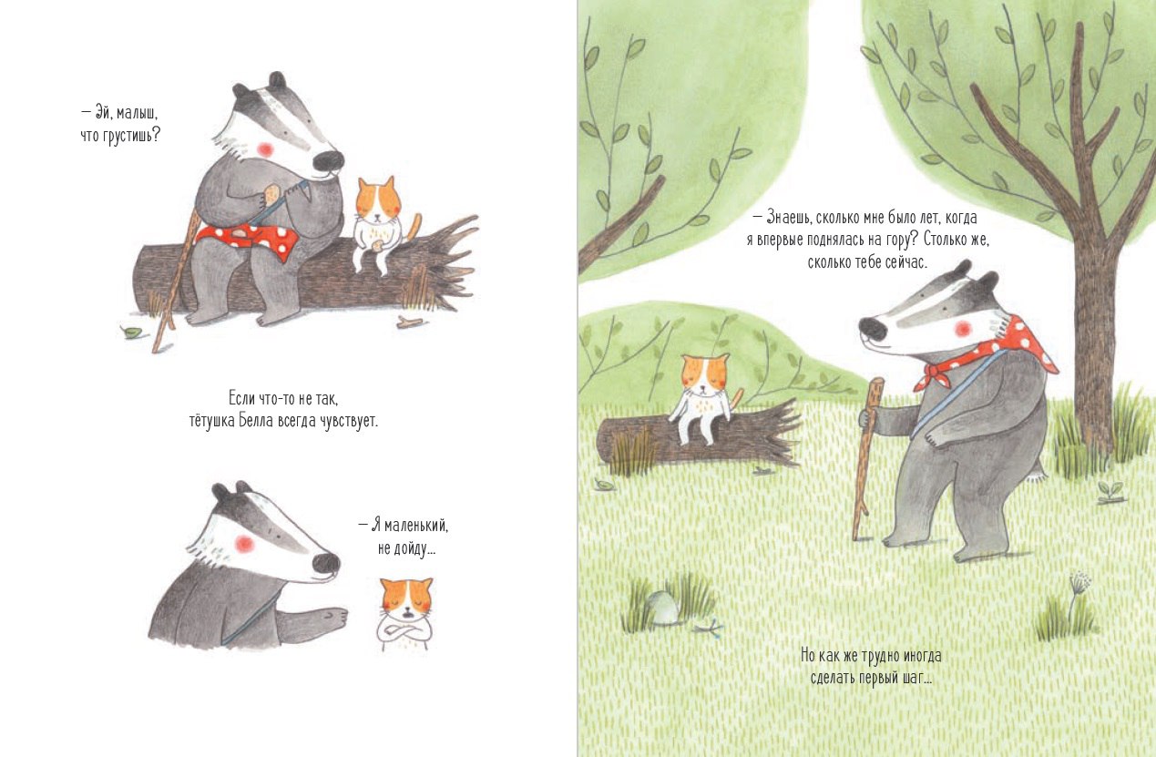 В погожий воскресный день барсучиха бабушка Белла отправляется по тропинке на вершину горы. По дороге она встречает друзей, собирает грибы и другие находки, любуется природой. Она многое знает о своей горе, ведь она всю жизнь поднимается по одной и той же дороге туда, откуда можно увидеть весь мир. Однажды утром она встречает Тима, который мечтает забраться на вершину.