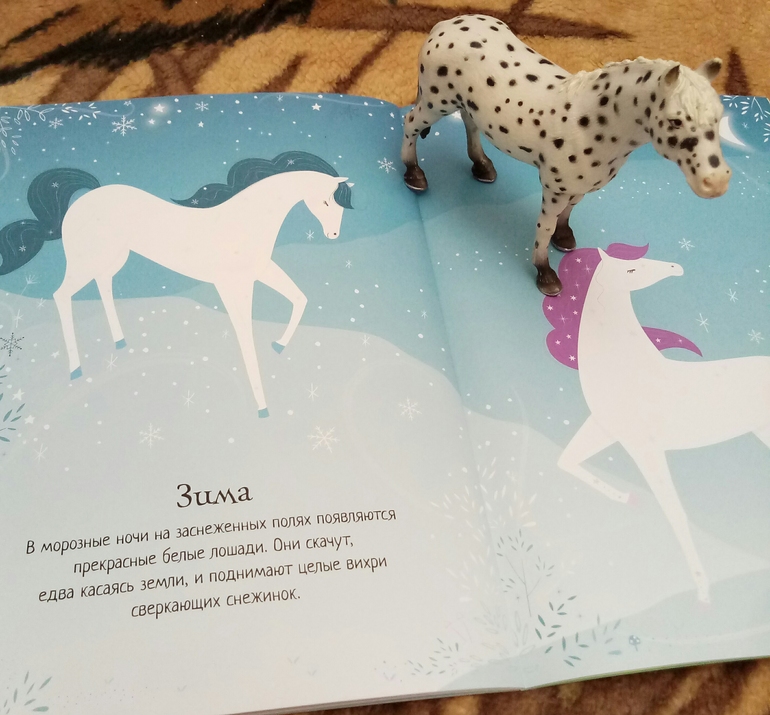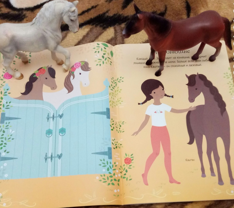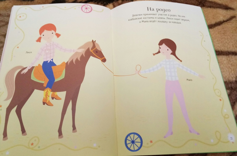 В книжке лошадки представлены везде, где их только можно найти) на конюшне, на лугу, в королевской упряжке, в цирке, на каруселе, и даже на родео
