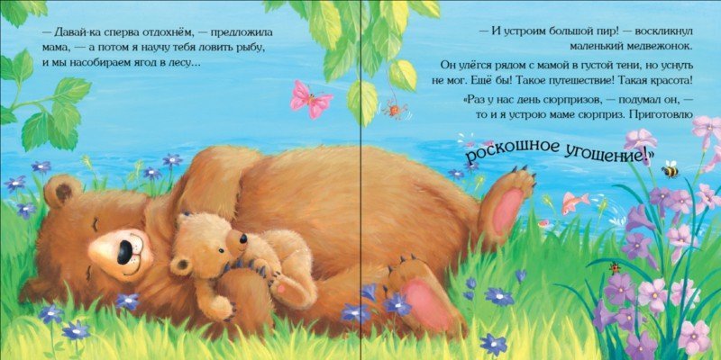 Жарким летним днём медвежонку не хотелось выходить из прохладной берлоги. Но мама-медведица предлагает ему отправиться в восхитительное место, где его ждёт и прохладная вода, и много вкусной рыбы и - главное - его любимое лакомство - земляника! Добравшись до лесного озера, мама-медведица прилегла отдохнуть, а медвежонок решил приготовить для неё сюрприз…