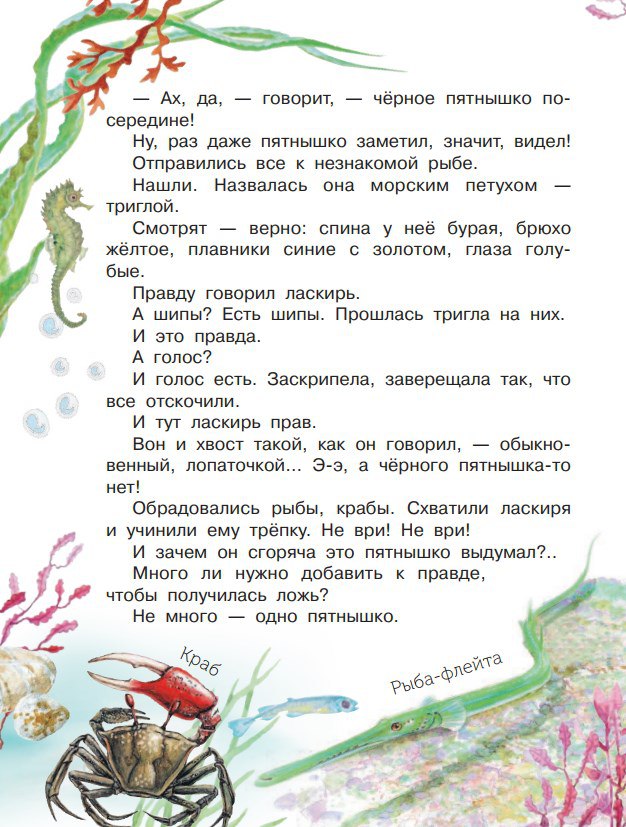 Книга Святослава Сахарнова "Морские сказки" познакомит читателей с разнообразными морскими обитателями: с навагой и триглой, ласкирем и скорпеной, белугой и мерланг-пикшей. А ещё расскажет, какие бывают киты, зачем отшельник в раковине прячется, как плывёт каракатица.