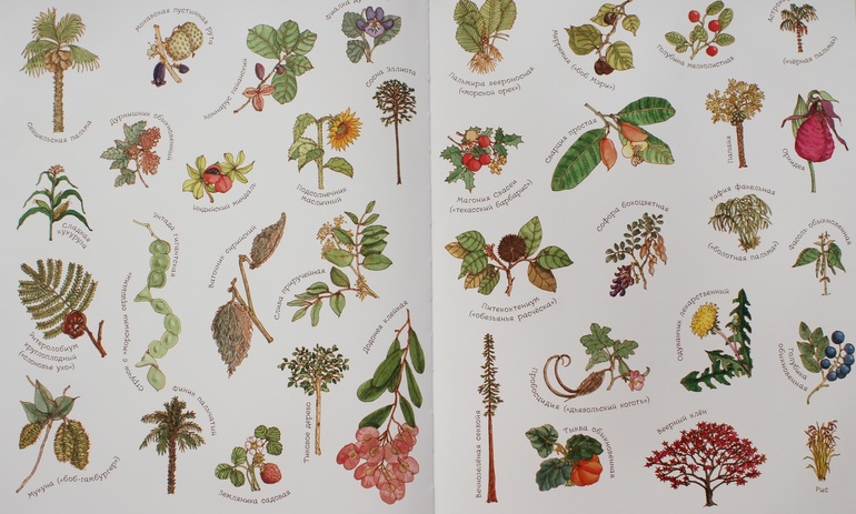 И кстати говоря, природный материал, на котором основываются книги, не так уж и прост. Например, семечки в этом артбуке практически все принадлежат мало популярным в наших широтах растениям. Знакомые сосны и одуванчики здесь соседствуют с такими диковинными названиями как сварция, додонея и рута. В конце книги есть также разворот-справочник, аналогичный расположенному в начале. Здесь мы видим различные растения, с которых семена попали в книгу. С его помощью можно играть в находилки-повторялки и что еще душе угодно.