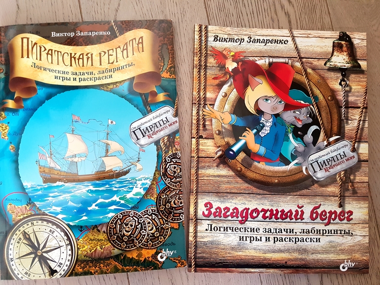 Книги в принципе идентичны, даже действующие лица одни и те же, одна пиратская тематика, но естественно задания по содержанию разные. Мне показалось, что Пиратская регата больше для мальчиков. Хотя все они дополняют друг друга, как серии в мультфильме. Именно в этой книжице, предстоит помочь пройти пиратам сквозь Морской туннель, преодолеть Безумный пролив, разгадать секреты полуострова Тайн, подобрать шифр секретного сообщения, ускользнуть из лап неприятеля и победить в битве! Кстати, для любителей шахмат. автор тоже придумал задание) И для любителей рисования, есть незаконченные наброски, которые дети с удовольствием доведут до конца.