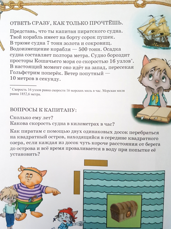 под обложкой дан старт пиратской регате. Старинная карта добыта, дует попутный ветер! По Кошачьему морю, на всех парусах мчится отважная Котес и ее друзья. Впереди таинственная земля Терра Кота. Нужно только пройти все испытания и победа в кармане! Каждая решенная задача, это путь к успеху не только героев книги, но и ребенка. Ведь решая их, ребенок развивает логику, память, внимание, воображение. Очень понравилось как сказано в обращении к читателю: