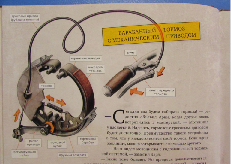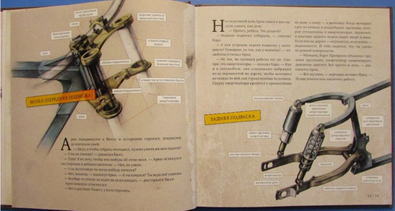 Мы узнаем, что общего у мотоцикла с автомобилем, а также разберемся в таких непростых механизмах, как амортизаторы, тормоза, сцепление, коробка передач и карбюратор. Узнаем, что такое зажигание и как оно работает? Как устроены фары и чем управляет стоп-сигнал и многое-многое другое.