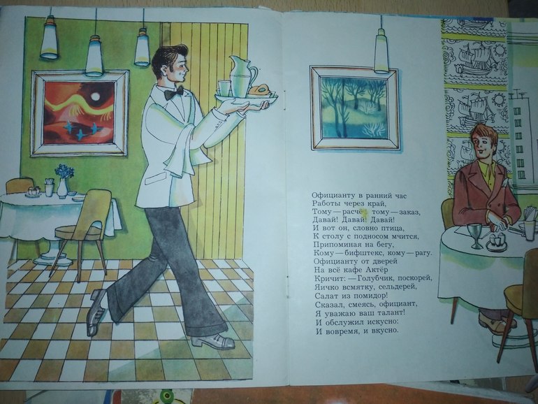 ну и наконец гениальная книга по идее. И. Токмаковой Утром во вторник с илл. Вольского. стихотворение об актере, который как раз отдает должное всем рядовым профессиям, которые "делают" нашу повседневную жизнь: