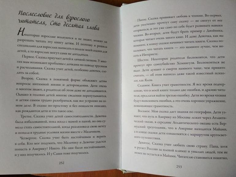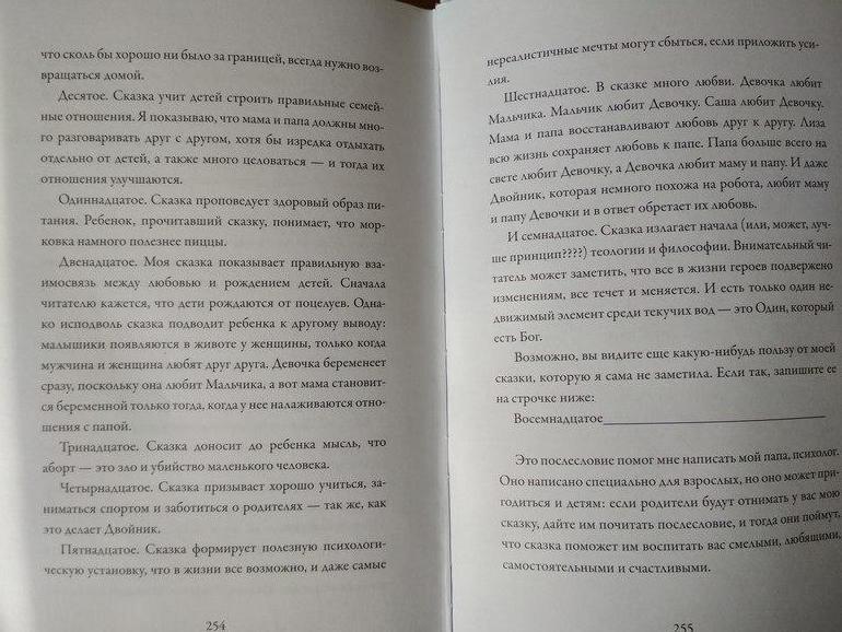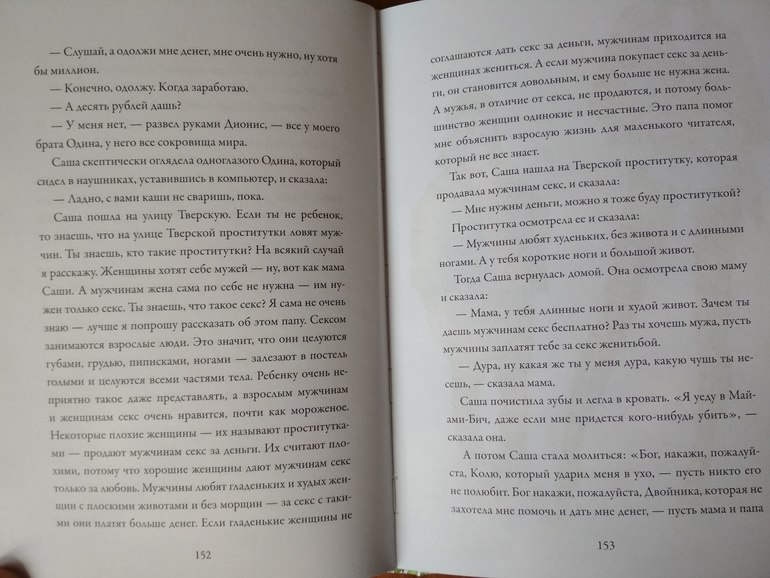 А почему это вдруг читатели будут брать пример с Двойника, которая хорошо учится и заботится о родителях, а не с Девочки, которая на всё забила и заделала пару Бэбиков (это имена такие, если что) от большой любви в 13 лет? Почему главный Бог в книге скандинавский Один? (он якобы программист и пишет нашу жизнь в виде всяческих квестов) А античный Дионис - его брат? Почему первая любовь Папы - вылитая Меган Фокс?))) В Америке и женщины лучше?)