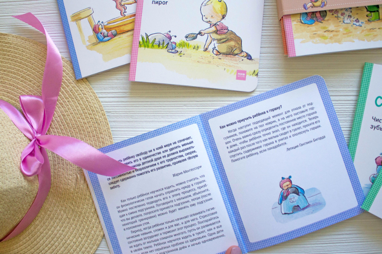 Помимо самих историй в каждой книжечке на последнем развороте есть сопроводительный текст с цитатами Марии Монтессори и советами монтессори-педагога. Как можно развивать самомстоятельность в детях, как без нервов приучить ребенка к горшку, спокойно ложится спать и.д.